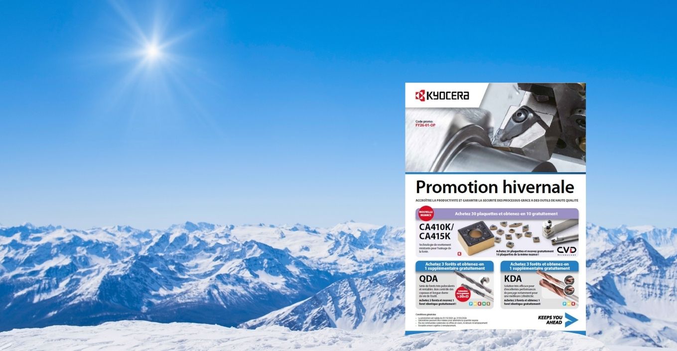 Avec la Promotion Hiver KYOCERA, équipez-vous d’outils ultra-performants, fiables et précis au meilleur prix, jusqu’au 27 mars 2026. Forets QDA et KDA, fraises Q series…