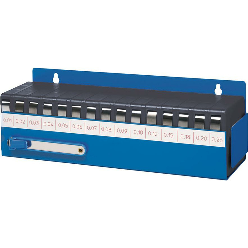 Clinquant sous boîte, Inox Modèle : bords arrondis, indication d'épaisseur en mm marquée (à partir de la taille 0,08 mm) sur le ruban à des distances régulières. Largeur du ruban 12,7 mm, longueur de 5 mètres. Livraison dans boîtier mural et avec support pour clinquant, 15 pièces. Applications : convient en particulier pour des contrôles récurrents de la même épaisseur de matériau, par ex, dans les contrôles en série. Egalement approprié comme support pour l'alignement de pièces de machine dans la production et le montage. En acier inoxydable.