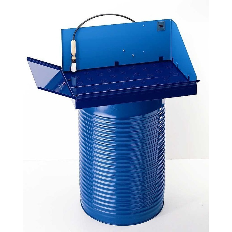 L800xP500xH270 mm Tôle 15/10, peinture époxy Conçue pour être posée sur un fût de 200 L Vendue complète, sans fût