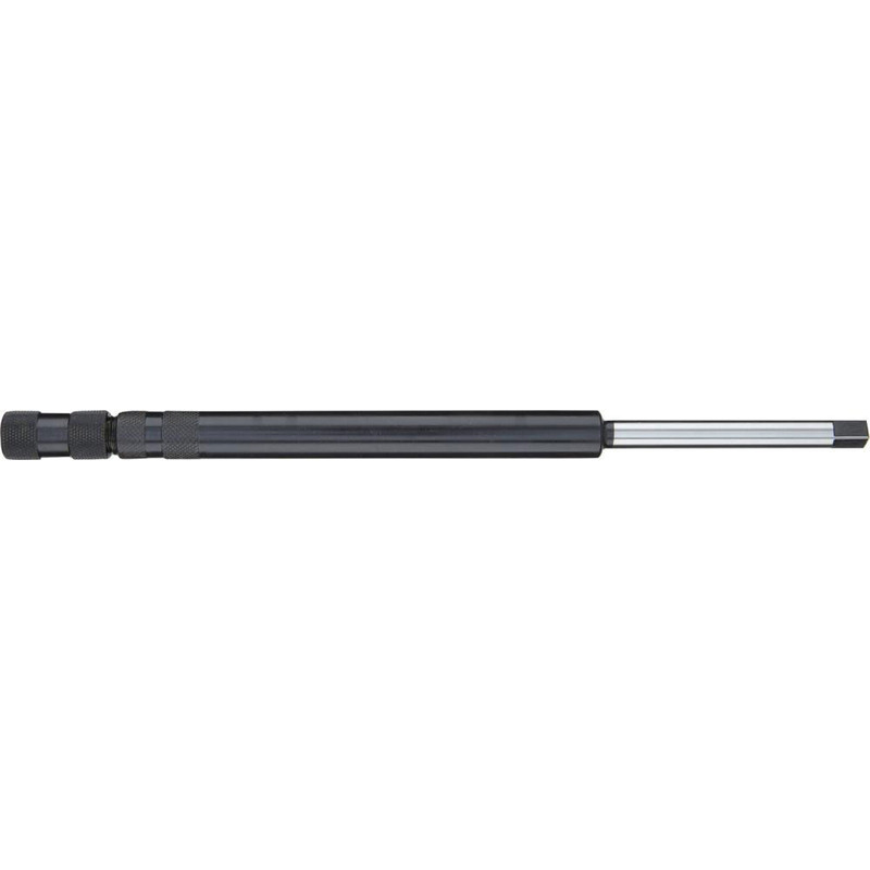 Modèle : en acier trempé, rectifié et bruni (protection antirouille). L'extrémité frontale est en forme de pince de serrage. Serrage avec écrou de serrage moleté. La partie arrière de la rallonge correspond à DIN, utilisation possible dans les embouts à serrage rapide et appareils à tarauder.