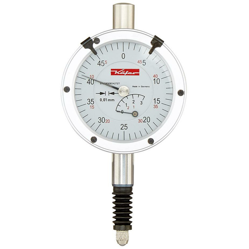 avec protection antichoc, touche mobile et queue d'emmanchement (Ø 8 mm h6) en acier inoxydable robuste, touche mobile rodée. La douille au guidage précis située au-dessus de la touche mobile est disposée et montée sur ressort de telle sorte que les chocs ne soient pas transmis au mécanisme du comparateur. Avec soufflet en caoutchouc sur la touche mobile et joint torique sur le cadran et sur la face arrière pour empêcher la pénétration des liquides et des impuretés.